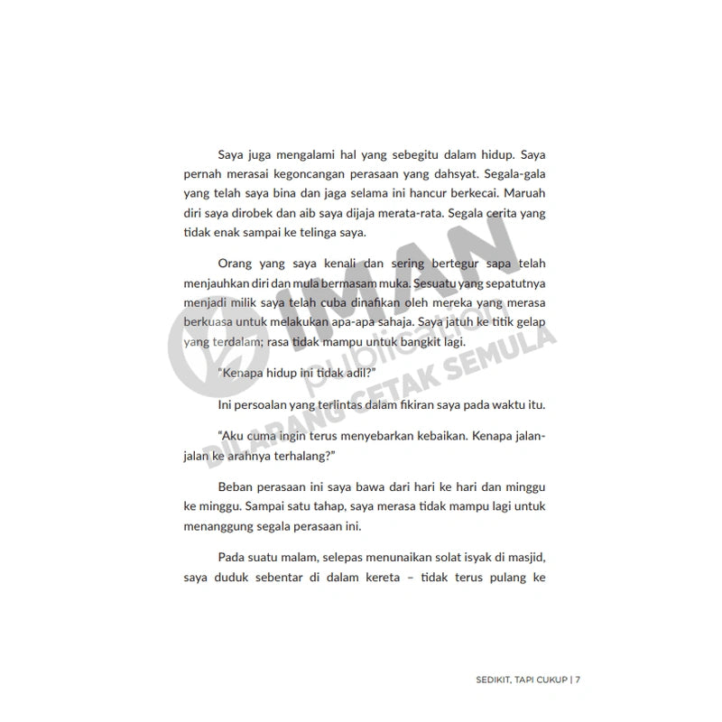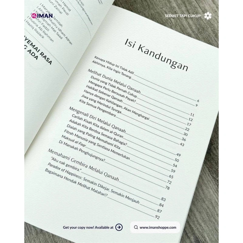 Menerusi buku ini, Fakhri Fadzli menjelaskan kepada kita bahawa punca segala masalah yang timbul akibat keinginan berterusan ini adalah kerana kehilangan rasa bahagia dengan apa yang ada. Dengan tulisan yang santai, penulis mengajar kita cara membina kekayaan jiwa melalui qanaah berasa cukup dan reda dengan susunan Allah SWT.