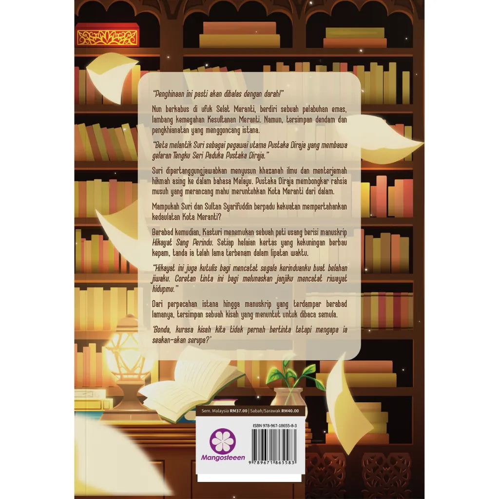 Suri dipertanggungjawabkan menyusun khazanah ilmu dan menterjemah hikmah asing ke dalam bahasa Melayu. Pustaka Diraja membongkar rahsia musuh yang merancang mahu meruntuhkan Kota Meranti dari dalam.