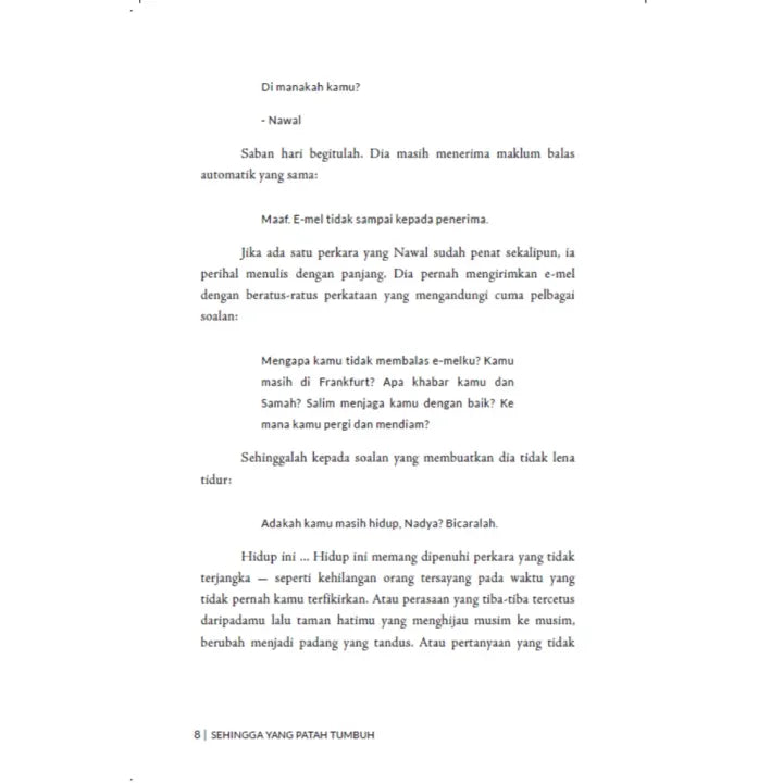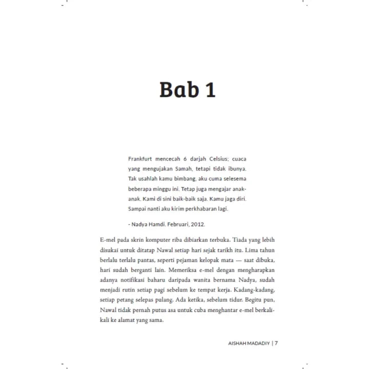Nawal Hamdi tekad. Kali ini dia memilih bersendirian. Dia tidak lagi berharap pada ayahnya. Dia tidak lagi peduli pada Wadi, lelaki yang telah menghancurkan harapannya. Mana mungkin perempuan yang kuat sepertinya kalah dengan emosi sendiri.