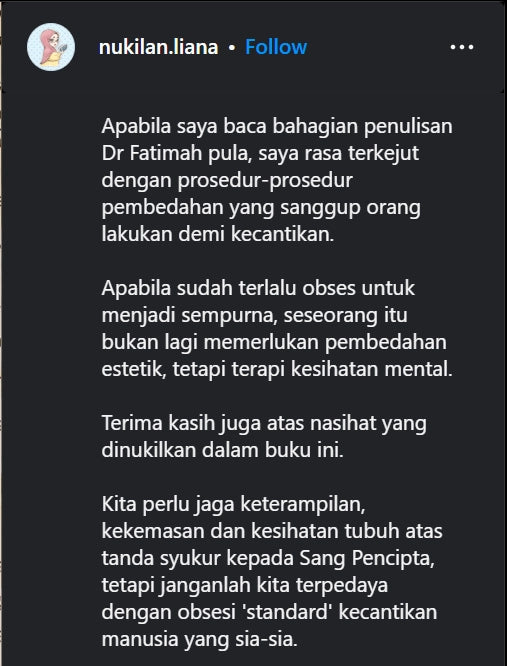 Maka kita berhempas pulas, berusaha pelbagai cara untuk “mencantikkan” diri, agar lebih diterima masyarakat dan tidak ditembak dengan kata-kata yang menghiris hati. Tak kurang juga berharap agar tidak hanya dipandang cantik luaran saja.