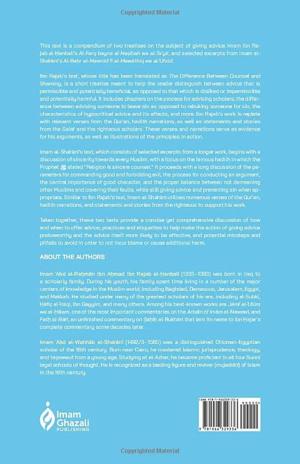 This text is a compendium of two treatises on the subject of giving advice: Ibn Rajab al-Hanbali's Al-Farq bayna al-Nasihah wa al-Ta’yir, and selected excerpts from Imam al-Sha'rani's Al-Bahr al-Mawrud fi al-Mawathiq wa al-'Uhud.