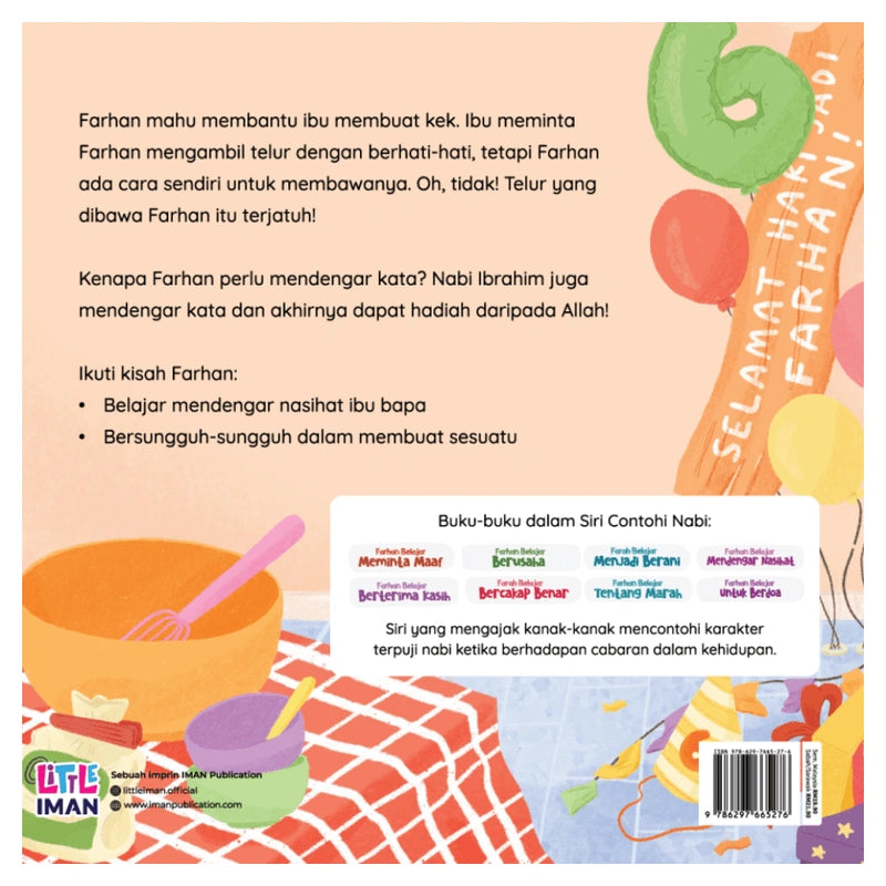 Farhan mahu membantu ibu membuat kek. Ibu meminta Farhan mengambil telur dengan berhati-hati, tetapi Farhan ada cara sendiri untuk membawanya. Oh, tidak! Telur yang dibawa Farhan itu terjatuh!
