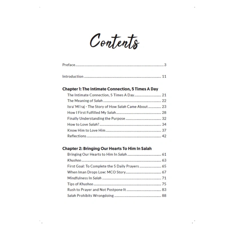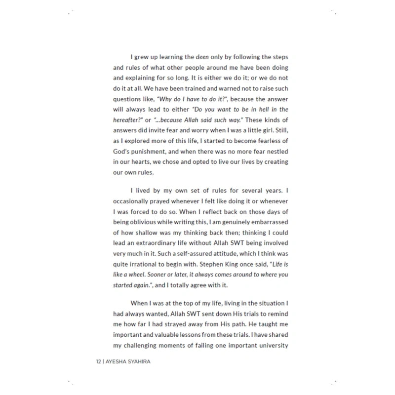In this book, Ayesha Syahira uncovers her secret gems and reflections on how she prepares herself for solah and how she stays focused and present while doing her five daily prayers.