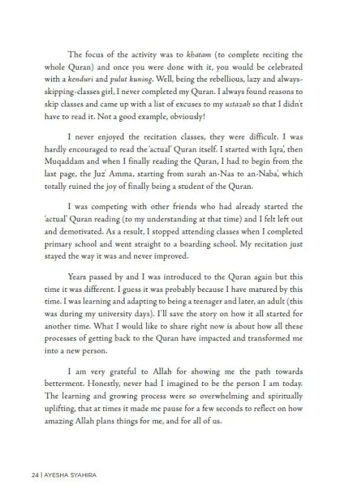In this book, author Ayesha Syahira shares the journey she took when she decided to make the Quran the companion she loves and trusts.