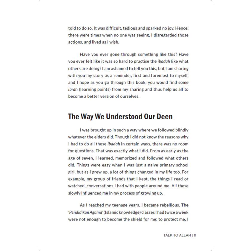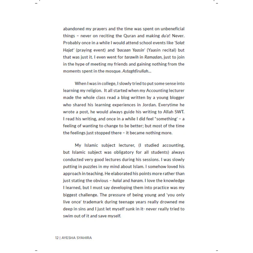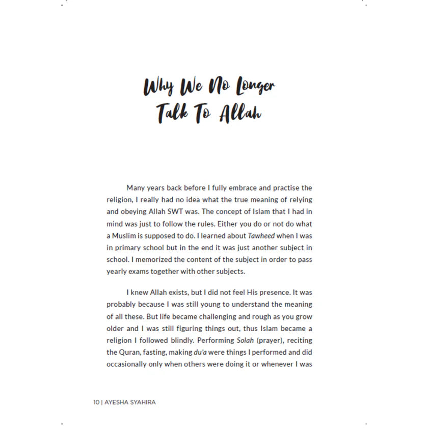 In this book, author Ayesha Syahira takes you on a journey of spiritual discovery; of reconnecting with Allah wholeheartedly. The author focuses on nurturing the lifestyle of talking to Allah; of finding comfort by making du’a to Him at any time of the day.