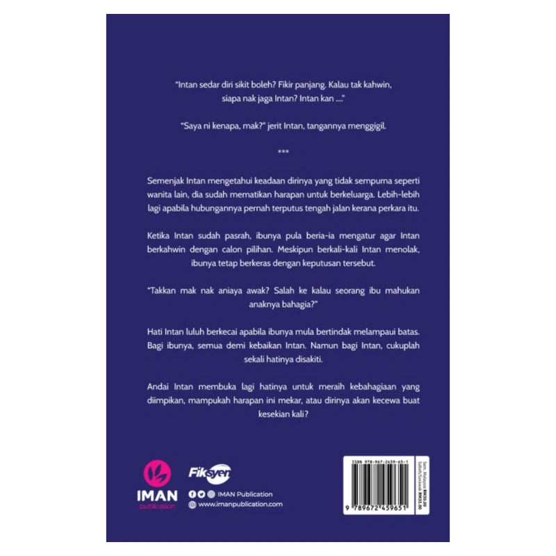 Semenjak Intan mengetahui keadaan dirinya yang tidak sempurna seperti wanita lain, dia sudah mematikan harapan untuk berkeluarga. Lebih-lebih lagi apabila hubungannya pernah terputus tengah jalan kerana perkara itu.