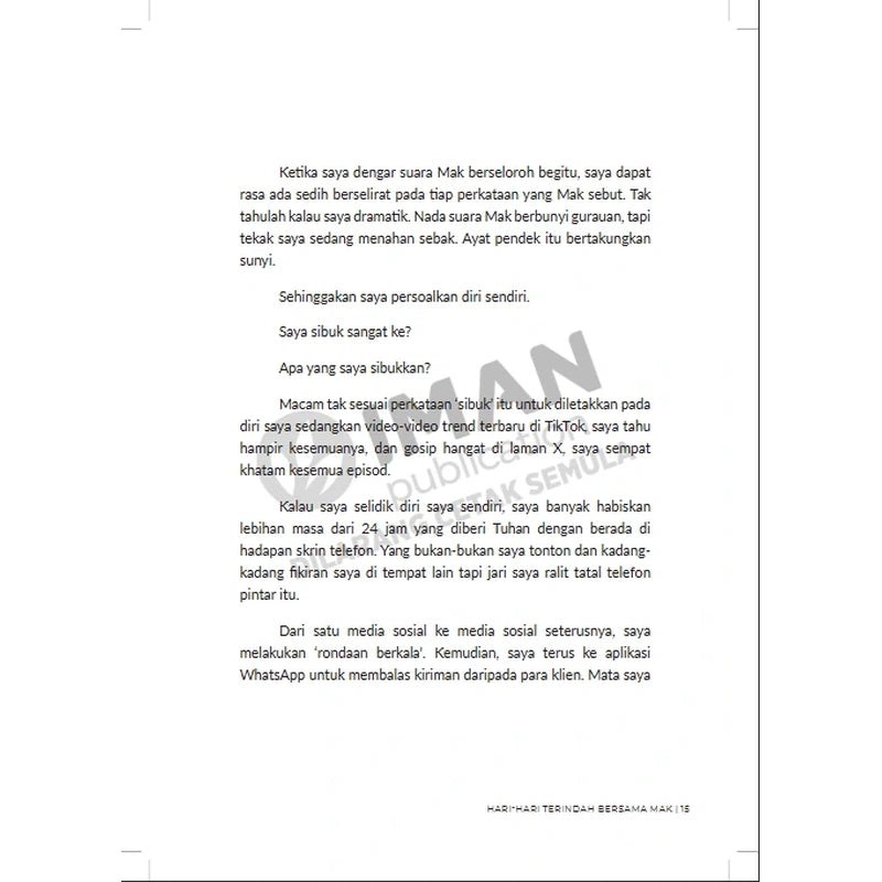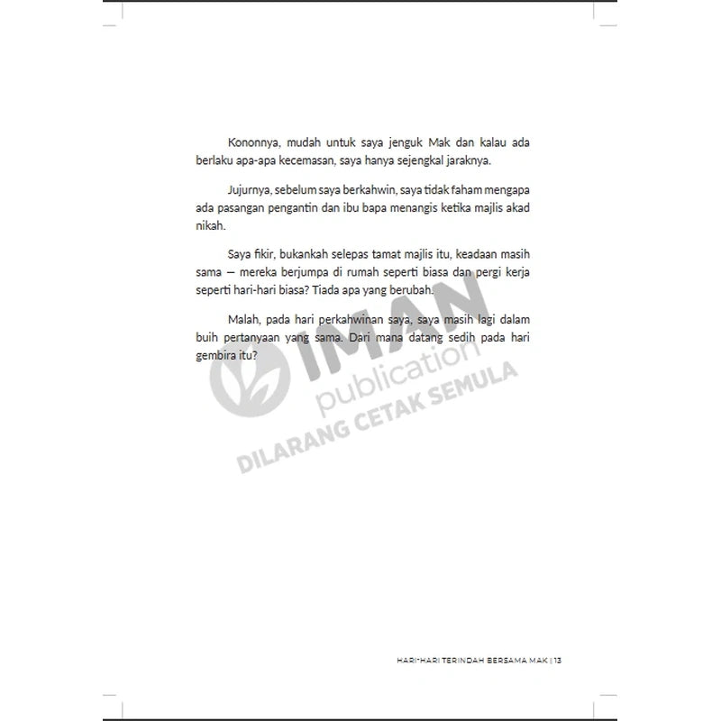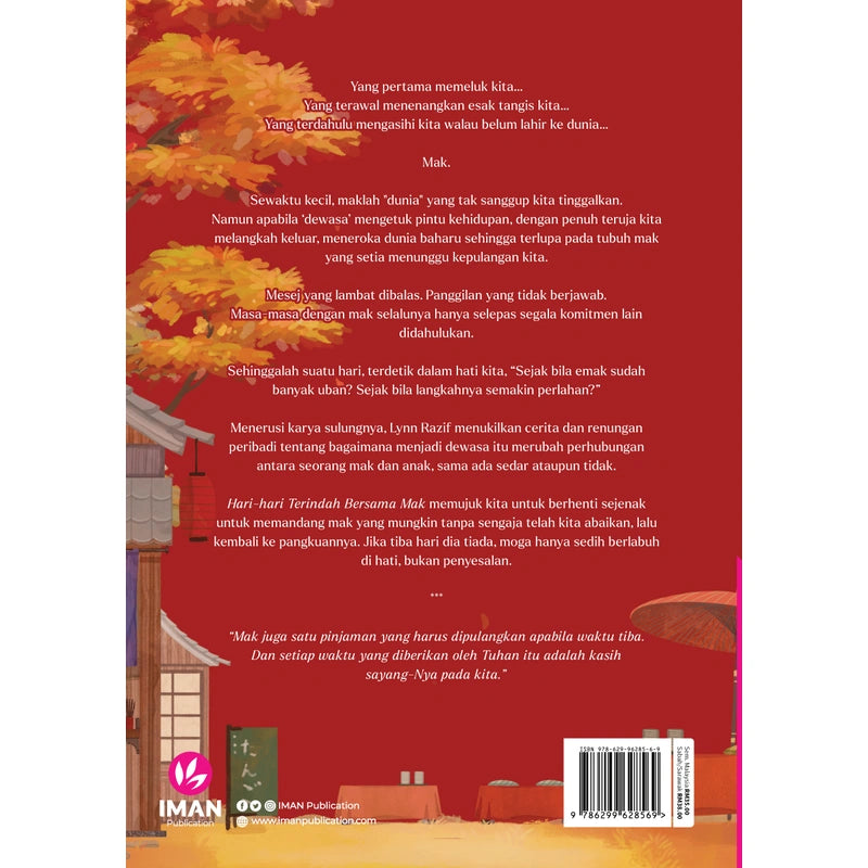 Hari-hari Terindah Bersama Mak memujuk kita untuk berhenti sejenak untuk memandang mak yang mungkin tanpa sengaja telah kita abaikan, lalu kembali ke pangkuannya. Jika tiba hari dia tiada, moga hanya sedih berlabuh di hati, bukan penyesalan.