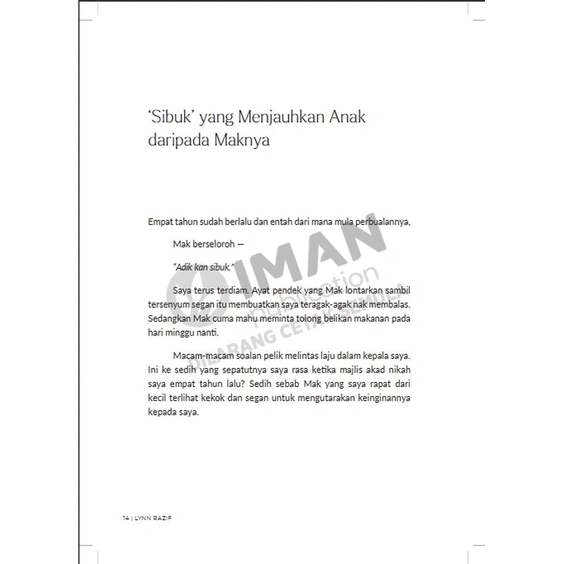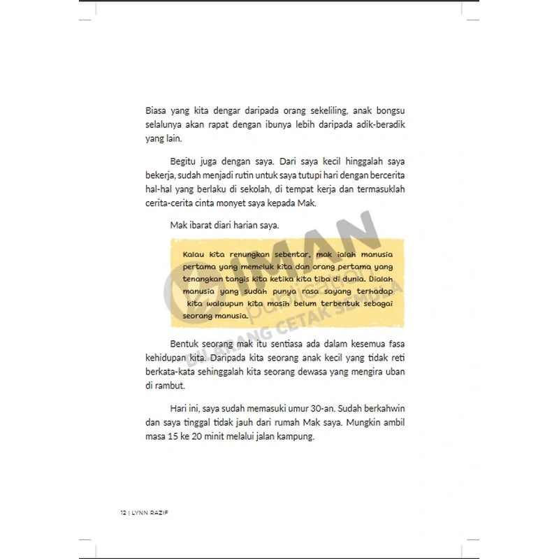 Menerusi karya sulungnya, Lynn Razif menukilkan cerita dan renungan peribadi tentang bagaimana menjadi dewasa itu merubah perhubungan antara seorang mak dan anak, sama ada sedar ataupun tidak.