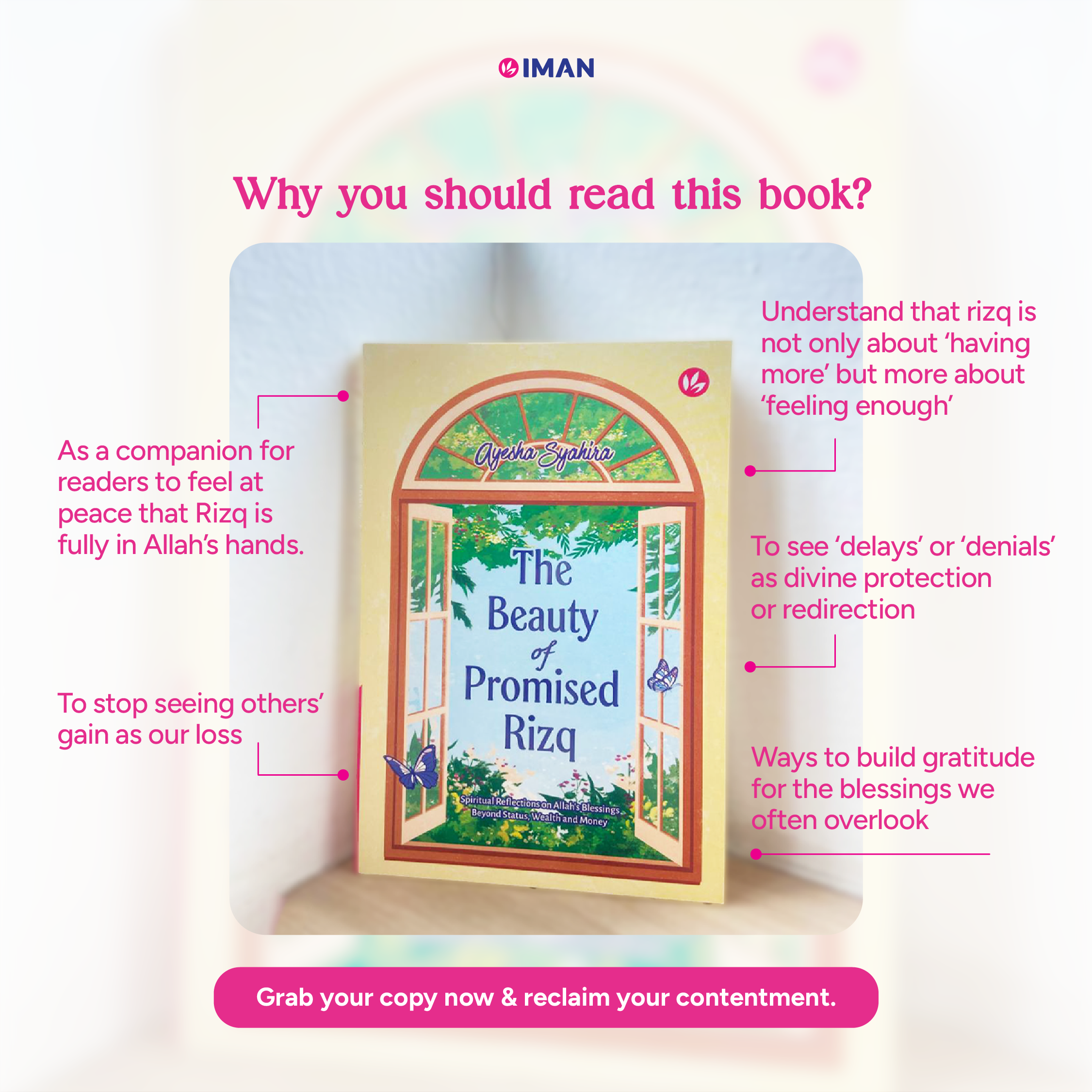 The Beauty of Promised Rizq takes readers on a reflective journey that explores the connection between our effort in daily life and the relationship we have with Allah SWT—The One who provides for us, especially on days we think we’re not getting enough.