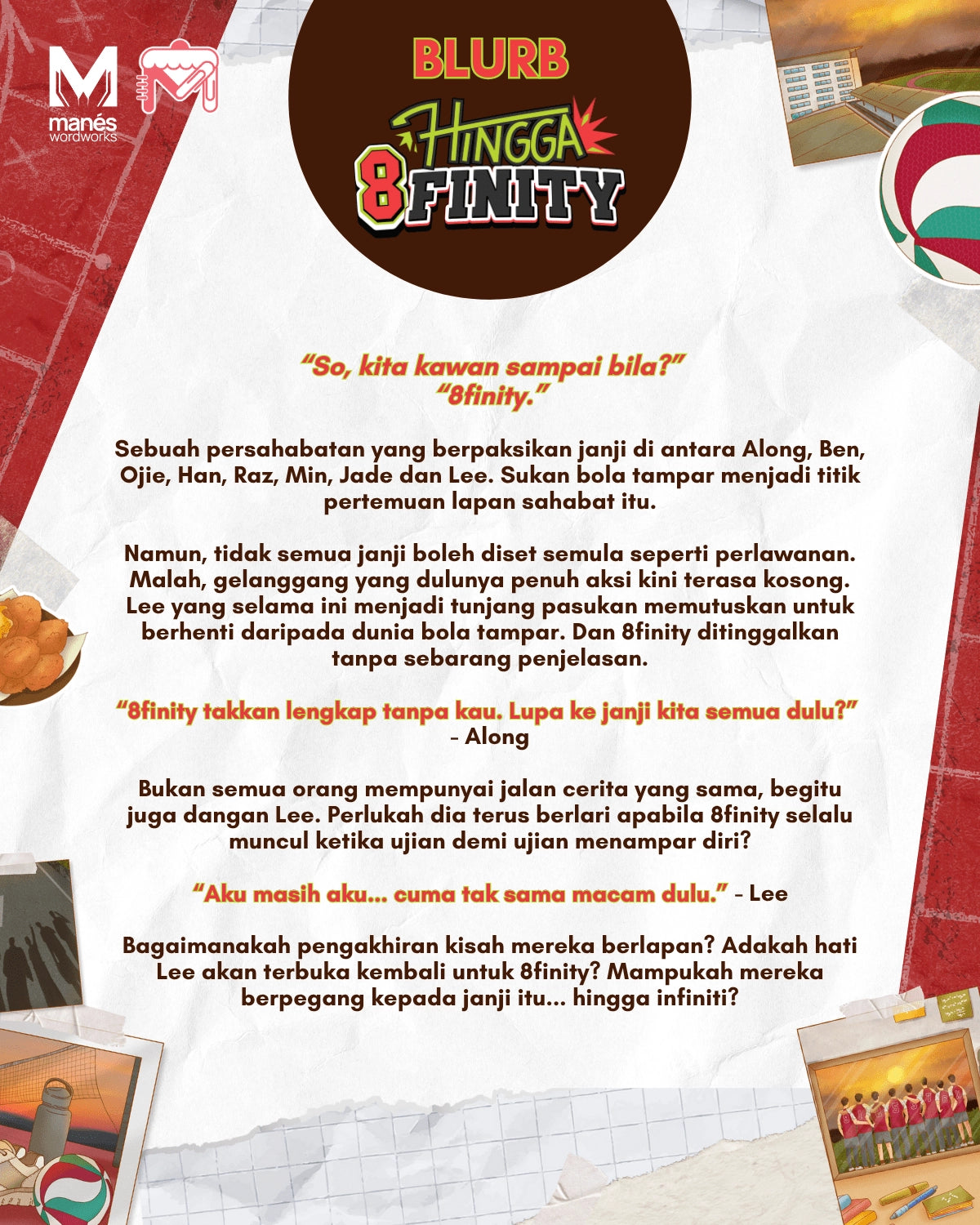 “So, kita kawan sampai bila?” “8finity.” Sebuah persahabatan yang berpaksikan janji di antara Along, Ben, Ojie, Han, Raz, Min, Jade dan Lee. Sukan bola tampar menjadi titik pertemuan lapan sahabat itu. Namun, tidak semua janji boleh diset semula seperti perlawanan. Malah gelanggang yang dulunya penuh aksi kini terasa kosong. Lee yang selama ini menjadi tunjang pasukan memutuskan untuk berhenti daripada dunia bola tampar. Dan 8finity ditinggalkan tanpa sebarang penjelasan. “8finity takkan lengkap tanpa kau. Lupa ke janji kita semua dulu?” – Along Bukan semua orang mempunyai jalan cerita yang sama, begitu juga dengan Lee. Perlukah dia terus berlari apabila 8finity selalu muncul ketika ujian demi ujian menampar diri? “Aku masih aku... cuma tak sama macam dulu.” – Lee Bagaimanakah pengakhiran kisah mereka berlapan? Adakah hati Lee akan terbuka kembali untuk 8finity? Mampukah mereka berpegang kepada janji itu... hingga infiniti? Kata Editor: Hingga 8finity merupakan sebuah naskhah segar untuk sebuah pengalaman penuh nostalgik. Menyuntingnya, menyeronokkan. Membacanya, bittersweet. – Pingu Toha, Editor